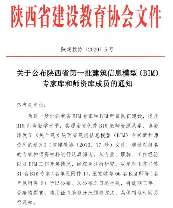 近日,陕西省建设教育协会印发了《关于公布陕西省第一批建筑信息模型(BIM)专家库和师资库成员的通知》(陕建教协〔2020〕5号)文件,金年会金年会官网青年教师张银环入选BIM专家库,青年教师王婷、高乐、杨红娟入选BIM师资库。