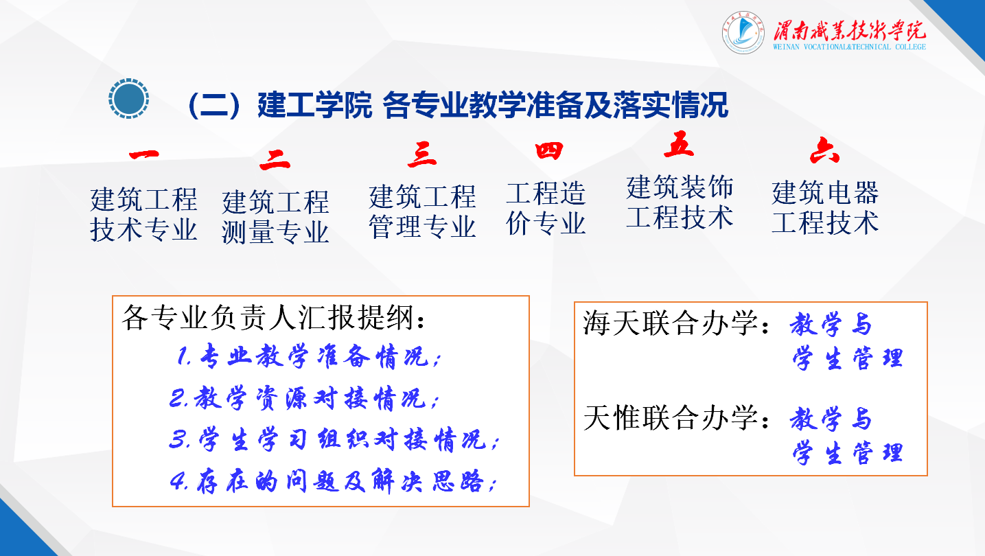 为进一步做好疫情防控期间的教学组织与管理工作,传达学校教学工作会议精神及2020年春季开学安排,金年会官网于2月16日19点召开线上工作会议。会议由建工学院院长孙志强主持,校教务处教务科科长蒲飞及建工学院全体教职工参加了会议。