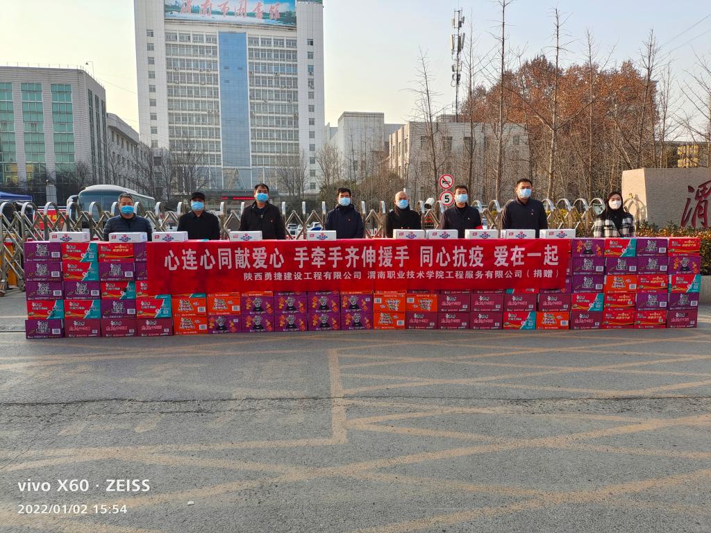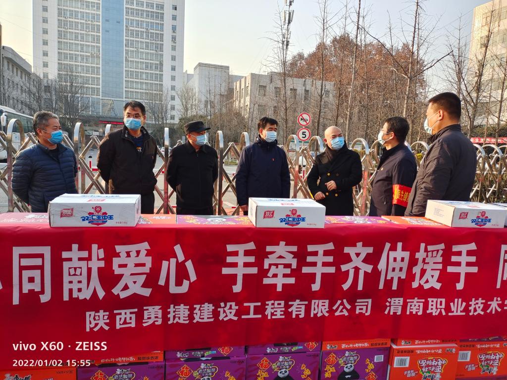 2022年1月2日下午,JINNIAN金年会工程服务有限公司、陕西勇捷建设工程有限公司助力金年会抗疫工作,慰问一线抗疫工作人员,并捐赠100箱方便面、10箱火腿肠等物资。王录军副书记、金年会官网院长孙志强、朝阳校区防疫办副组长张勇、基建处处长党晓鹏、保卫处副处长王伟、陕西勇捷建设工程有限公司董事长陈勇等参加捐赠仪式。