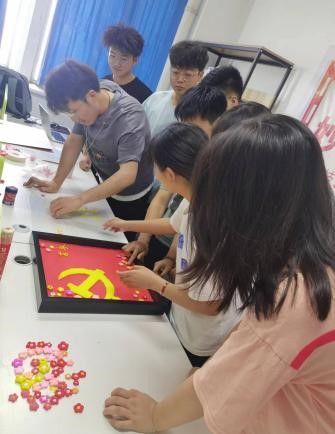 团队学生发挥专业优势,进行设计和制作。这幅作品长40cm,宽40cm,由党徽和“喜迎二十大,永远跟党走”十个字组成,团花锦簇。