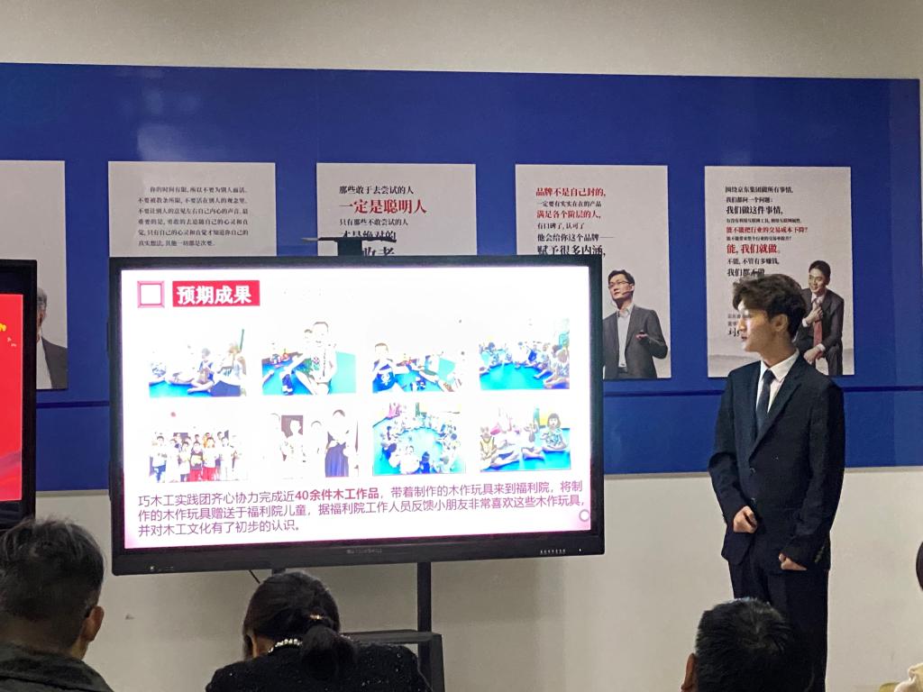 参加答辩的三个项目分别为:员世博同学负责的“福利院巧木工”;宋梦彤同学负责的“传承非遗面花,助推乡村振兴”;刘建坤同学负责的“爱护环境,保护地球母亲”。