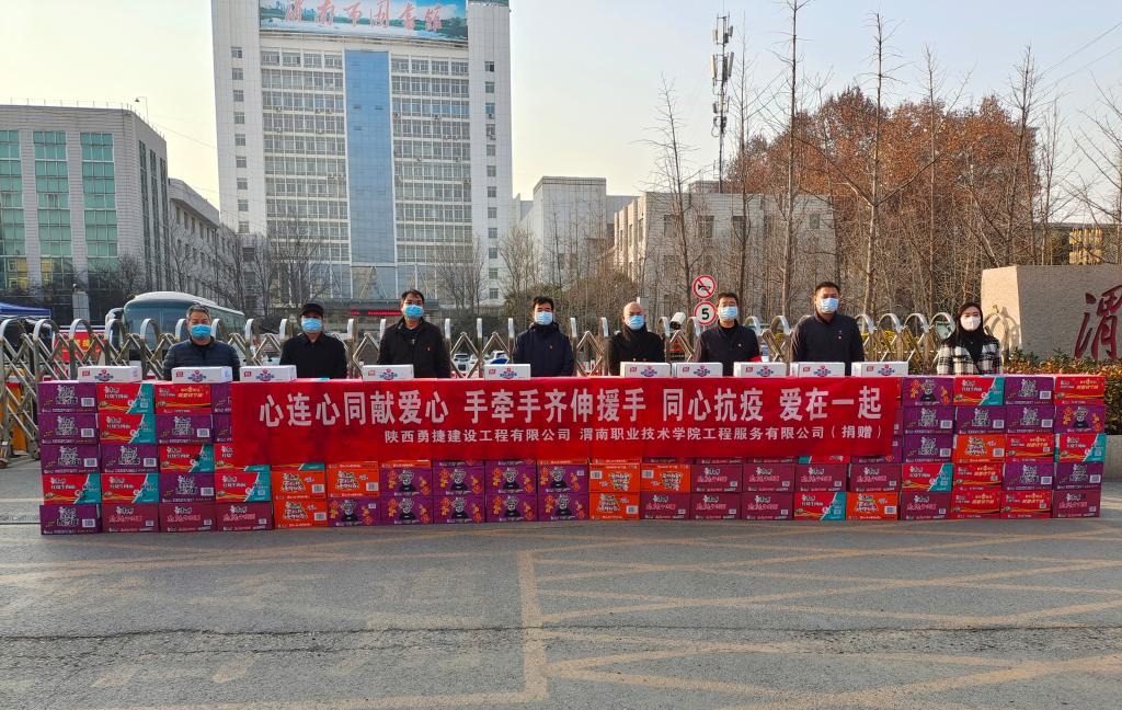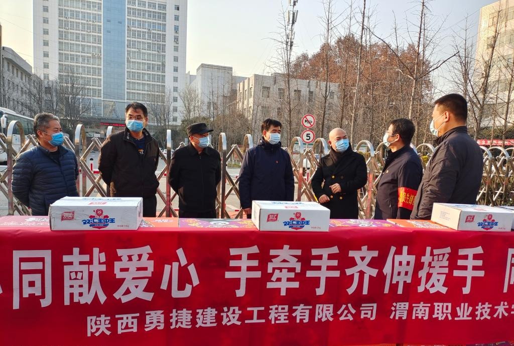 2022年1月2日下午,JINNIAN金年会工程服务有限公司、陕西勇捷建设工程有限公司助力金年会抗疫工作,慰问一线抗疫工作人员,并捐赠100箱方便面、10箱火腿肠等物资。王录军副书记、金年会官网院长孙志强、朝阳校区防疫办副组长张勇、基建处处长党晓鹏、保卫处副处长王伟、陕西勇捷建设工程有限公司董事长陈勇等参加捐赠仪式。