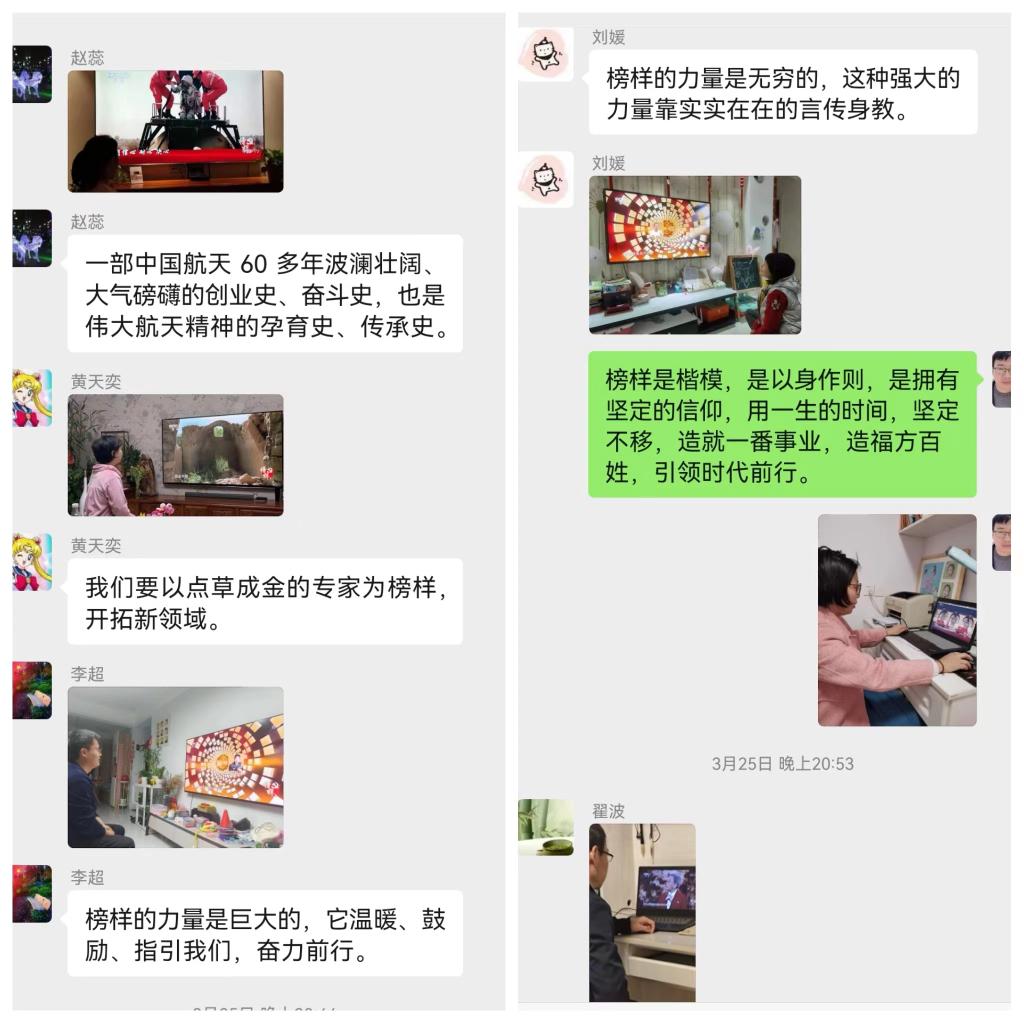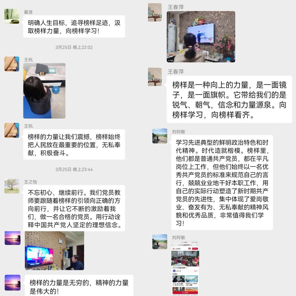 3月25日晚20:00教工支部组织全体党员同志,通过电视、手机等媒体准时观看了由中央组织部、中央广播电视总台联合制作了《榜样7》专题节目,所有党员同志认真观看了专题节目并将观看场景照片和自己的观看感悟发到教工支部微信工作,进行了热烈的交流讨论。