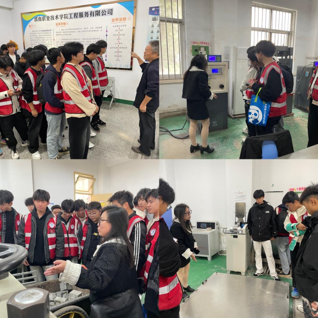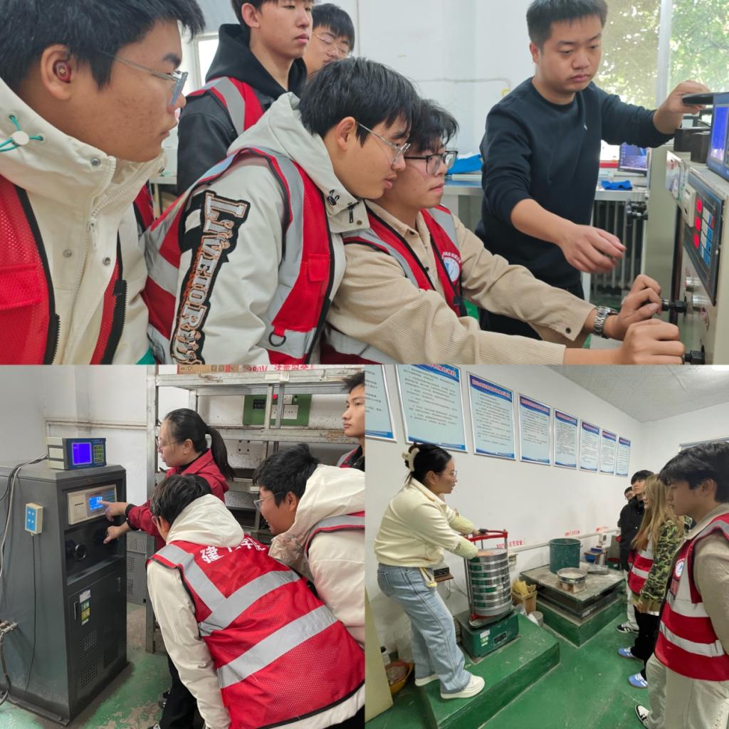 教学现场,JINNIAN金年会工程服务有限公司专业检测人员韩文平首先向学生们介绍了建筑原材检验的重要性、送检流程及检验室设置等。接着,公司专业检测人员带领学生介绍了各专项检验室所检测的项目、涉及的规范要求等,并详细讲解了混凝土、钢筋、水泥、土工、防水材料、节能、门窗、水电、市政等各专项检验设备的操作流程、设备仪器使用要求、安全管理等。随后,在专业检测人员和老师的指导下,学生们进行了混凝土试块抗压强度检测、钢筋拉拔试验、砂的筛分试验操作实践。